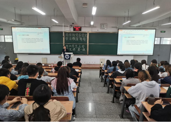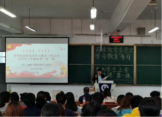 2020年4月27日于教学北楼102教室,药学院举办了党史学习教育“每月为大学生上专题党课”第一课活动,药学院党委副书记副院长陈建平为主讲人。药学院党委书记张东宇,学生第二党支部书记闫柄伏以及药学院全体党员参加了本次活动。