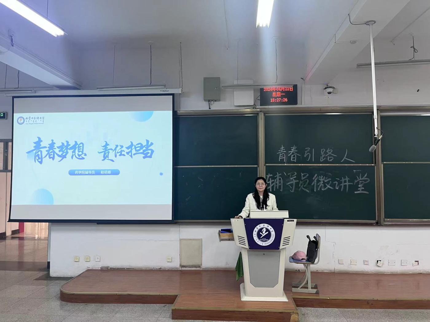 4月22日,学生工作办公室(团总支)副主任(副书记)赵晓娜做题为“青春梦想 责任担当”的讲座。讲座中,赵晓娜老师结合个人经历,为同学们进行了“大学生志愿服务西部计划”政策解读,并鼓励同学们在基层中练就过硬本领,在实践中服务社会,以青春的力量助力西部地区发展,让青春在全面建设社会主义现代化国家的火热实践中绽放绚丽之花。