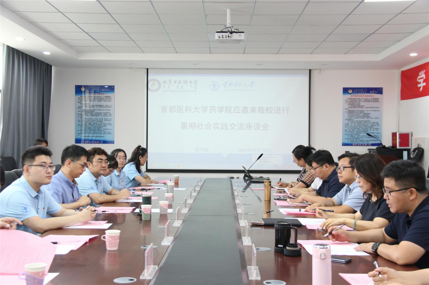 座谈会上,王焕芸对首都医科大学参与本次座谈会的各位老师、同学表示热烈的欢迎,指出本次座谈会是两院加强专业、学科、师资队伍建设的重要举措,同时希望通过组织学生参与社会实践,不断提升学生社会实践能力,强化学生社会责任感。王玉记做题为《发展新质生产力——首医药学学科与专业建设》的讲座。首都医科大学药学院团委书记康佳璐围绕党团建设,结合日常工作做经验交流。首都医科大学药物化学系党支部书记冯琦琦就科研工作进行介绍、分享。双方就专业及学科建设、学生培养等方面进行了研讨交流。曹作勤做总结发言,指出此次交流不仅加深了两院之间的了解和友谊,更是一次相互促进、共同成长的历程,通过与对方学院的深入交流,实现了互相借鉴、互相启迪。同时,鼓励学生们利用假期时间,积极投身家乡的社会实践活动,了解家乡的发展变化,增强服务家乡的意识和能力。并勉励同学们坚定理想信念,在实践活动中诠释新时代青年的责任与担当。
