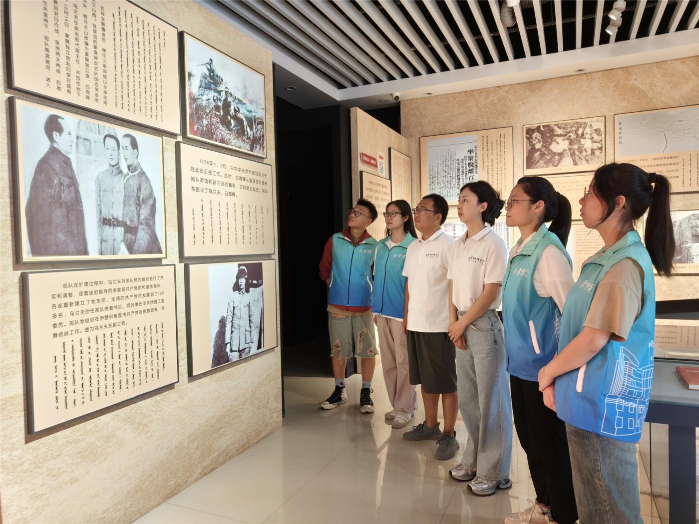 7月23日,师生参观了百灵庙抗日武装暴动纪念展厅,在讲解员的介绍下,师生了解了在中共西蒙工委书记乌兰夫的领导下,由云继先、朱实夫、云蔚率领蒙古地方自治政务委员会保安队千余名爱国官兵,反抗日本侵略,反对德穆楚克栋鲁普分裂祖国的革命壮举。百灵庙抗日武装暴动虽然距今已有80多年了,革命斗争的烽烟早已随风飘散,但历史沉淀下来的革命精神和爱国情怀却历久弥新,在中华大地上激荡。两院师生共同参观百灵庙抗日武装暴动纪念展厅,是对抗日英烈们的告慰和缅怀,也是对英烈们精神的传承与弘扬。