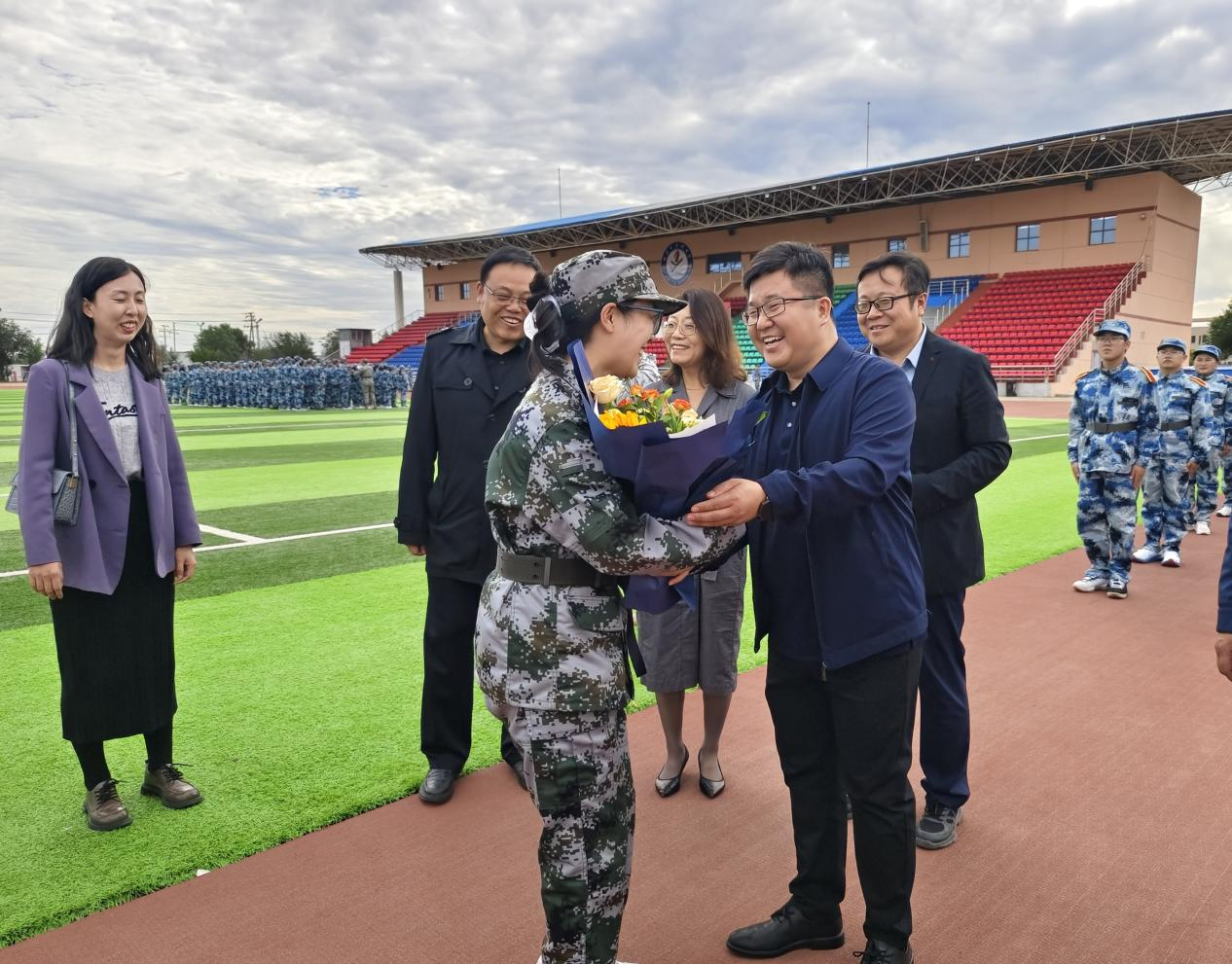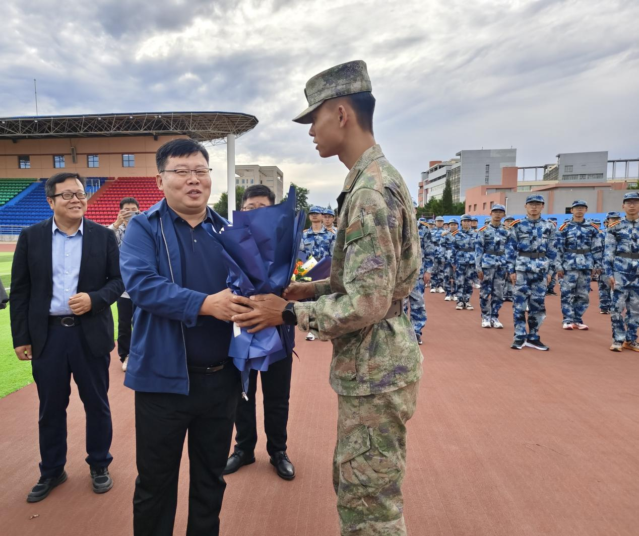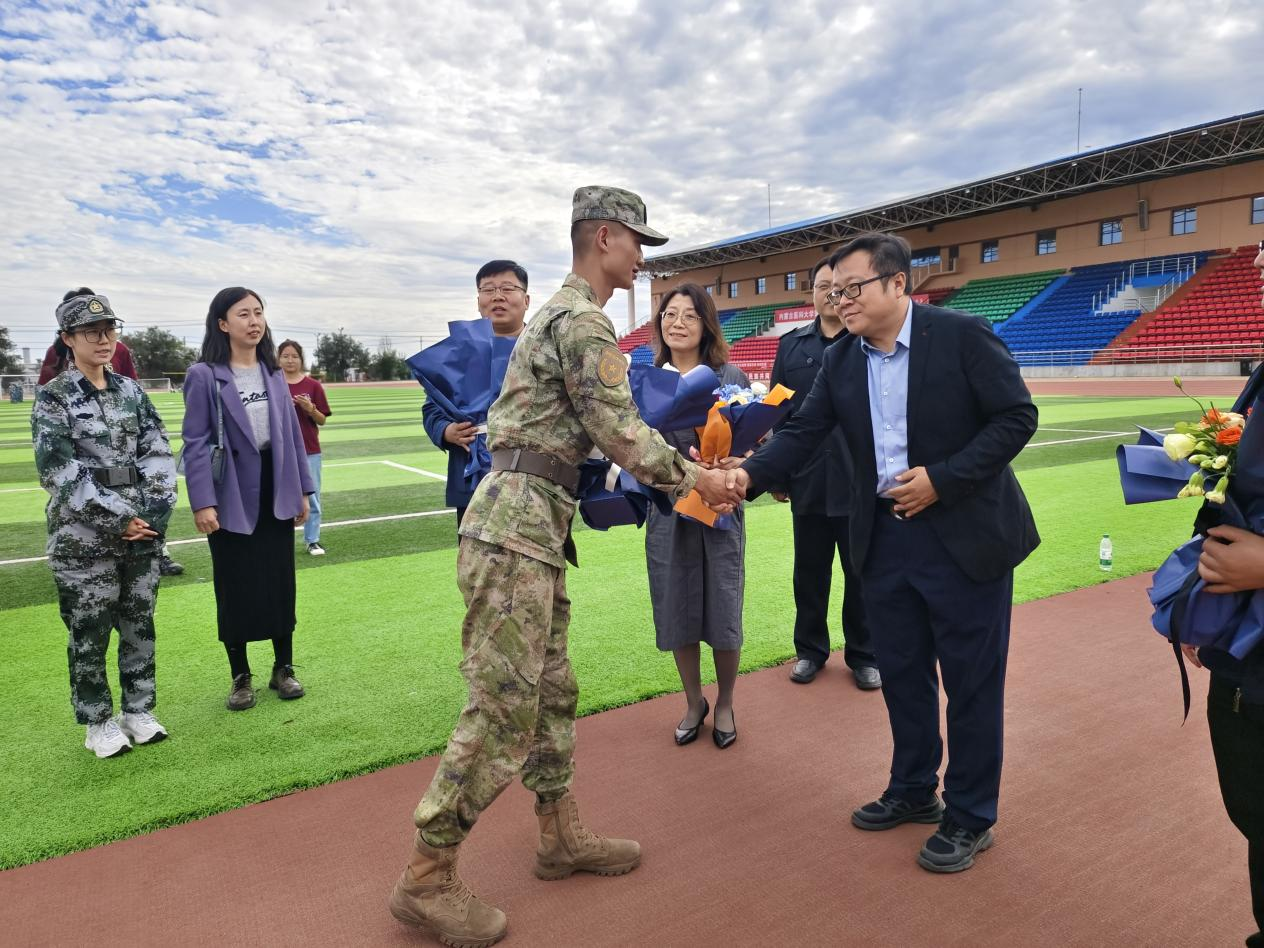 学院领导对全体军训教官和指导员的辛勤付出表示感谢,对参训学生昂扬向上的精神风貌给予充分肯定,并详细了解学生军训安排以及训练情况。