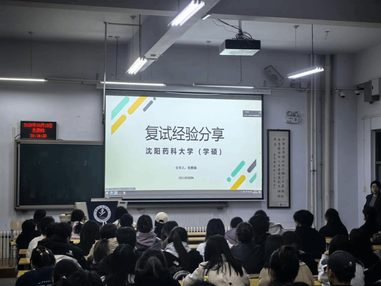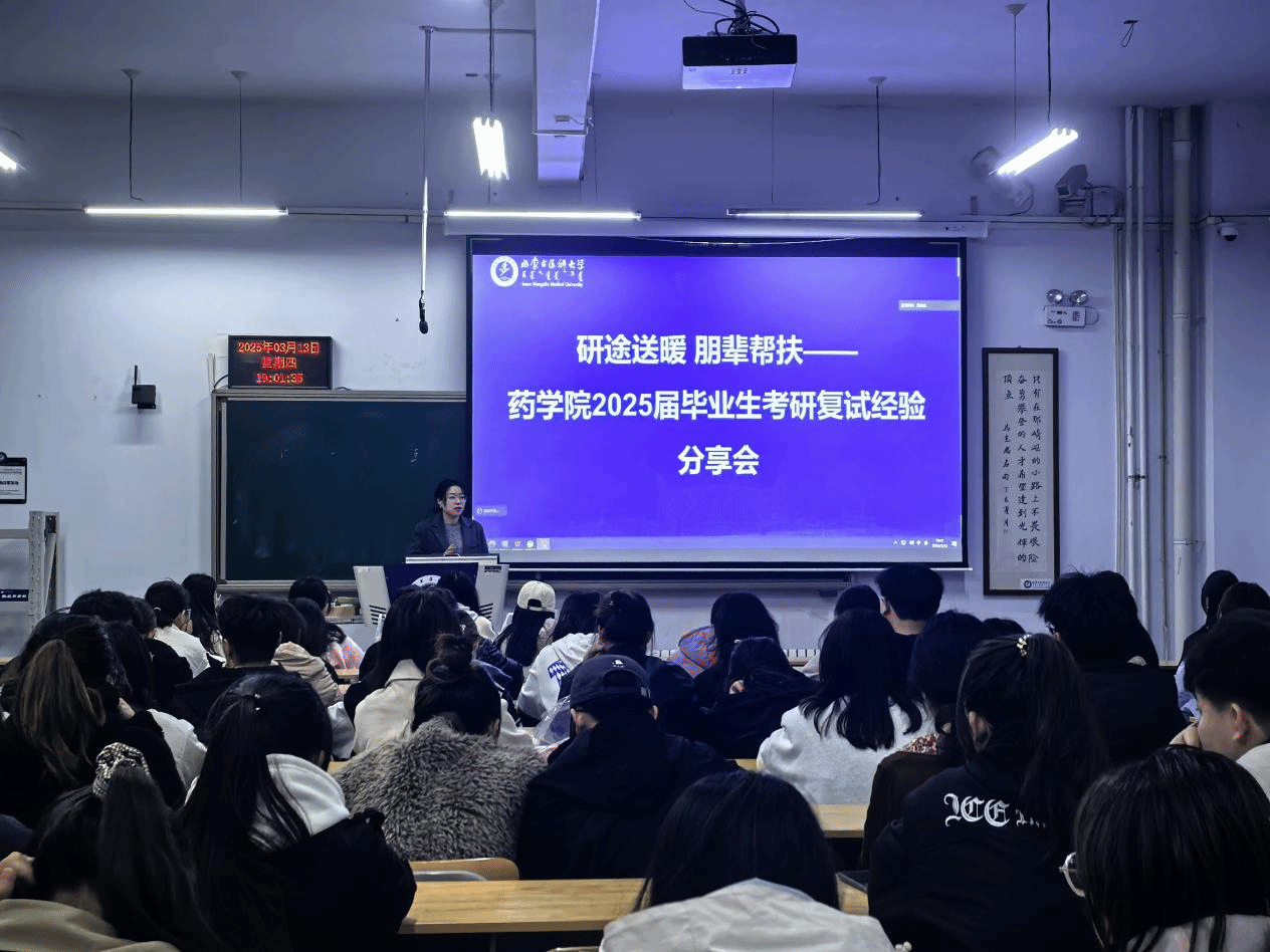 3月13日,药学院于问学堂106举办“研途送暖 朋辈帮扶”——2025届毕业生考研复试经验分享会。活动邀请6名往届毕业生通过线上、线下相结合的方式与同学们进行交流分享,我院近200名应届毕业生参加了本次分享会。分享会由辅导员马爱媛主持。