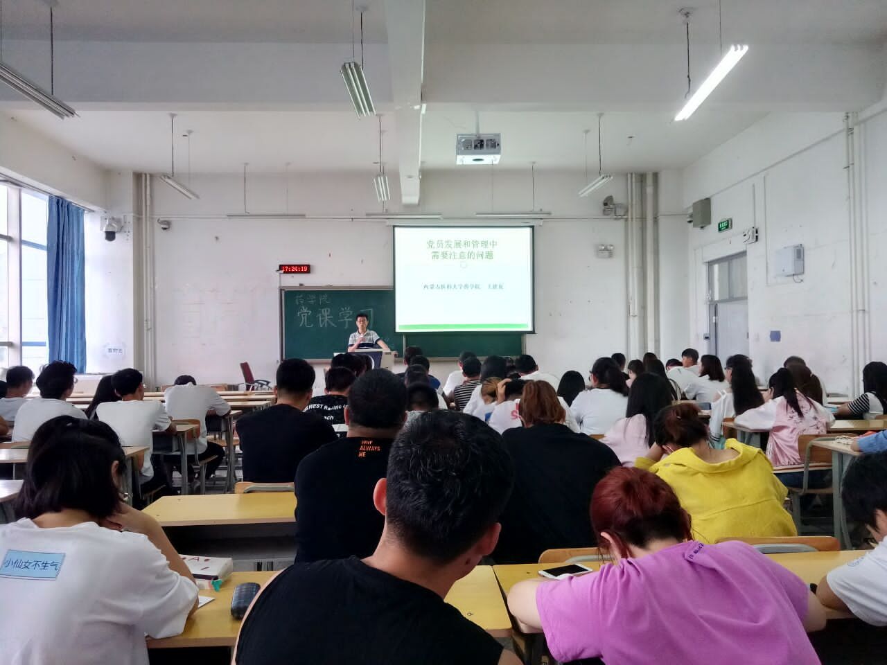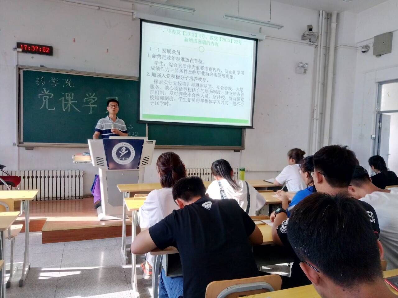 2018年6月12日下午5:30,药学院团总支(学工办)在教学楼北楼106教室组织开展了党课学习班。本次第一讲党课由学院党总支书记王建允同志讲授,学院学工办老师于敬茹、梁宇光以及入党积极分子和预备党员参加了本次党课学习。
