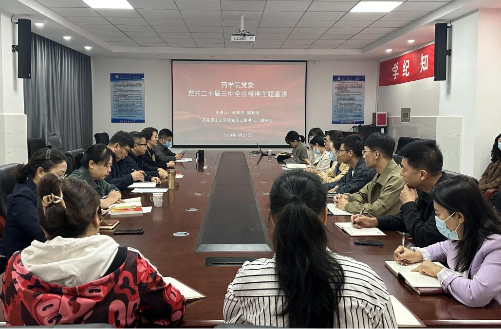 为认真学习宣传贯彻党的二十届三中全会精神,教育引导广大师生员工深入理解、全面把握全会精神实质,9月27日上午,药学院党委邀请学校党的二十届三中全会精神主题宣讲团成员、马克思主义学院党总支副书记、副院长张季平同志,作题为《绘就进一步全面深化改革新蓝图——党的二十届三中全会精神解读》的专题辅导讲座。学院党委领导班子成员,各党支部书记、党支部委员,各办公室、教研室、中心、GLP负责人,学生党员代表参加讲座。讲座由党委书记曹作勤主持。