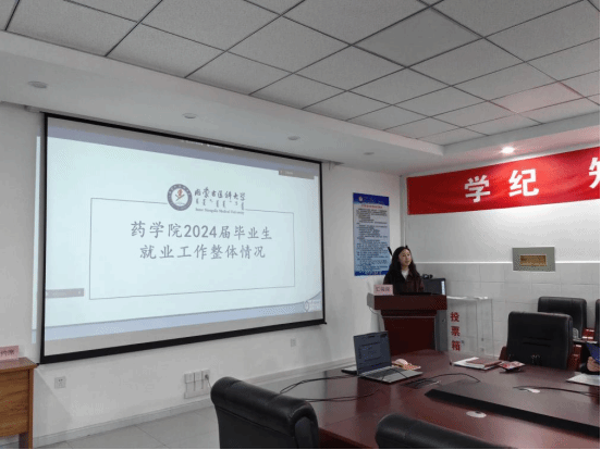 会上,学生工作办公室(团总支)副主任(副书记)闫柄伏就2024届毕业生就业工作进行总结汇报,辅导员代表马爱媛、2024届毕业班班主任李瑞娟、生药学教研室主任田景民进行就业工作经验分享。