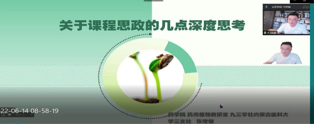 2022年6月14日上午,药学院第1期课程思政建设讲座以腾讯会议的形式举行,邀请到我院药用植物教研室张传领博士做了《关于课程思政的几点深度思考》专题讲座,参加讲座的教师约200余人,副院长王晓琴教授参加了本次活动。