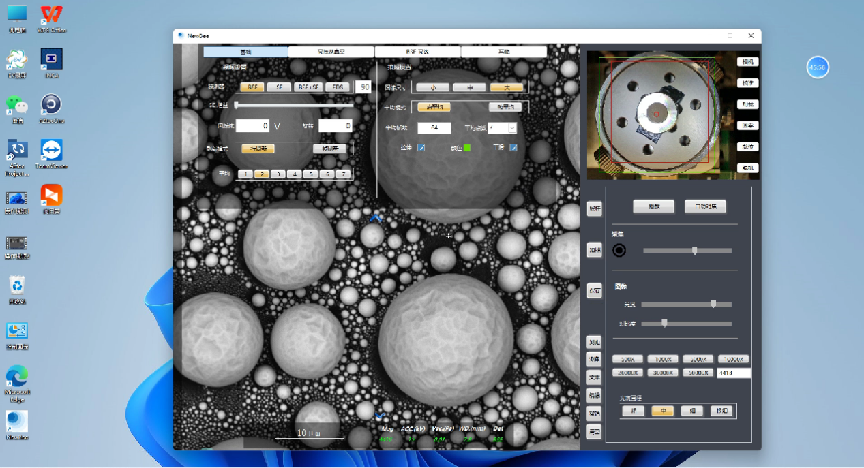 该扫描电镜能谱一体机采用自主研发的钨灯丝电子枪,加速电压在3-18kV范围内连续可调,配有二次电子探测器及四分割背散射电子探测器,可同时采集信号,可设定任意比例混合成像,同时满足形貌观测及元素分析需求。